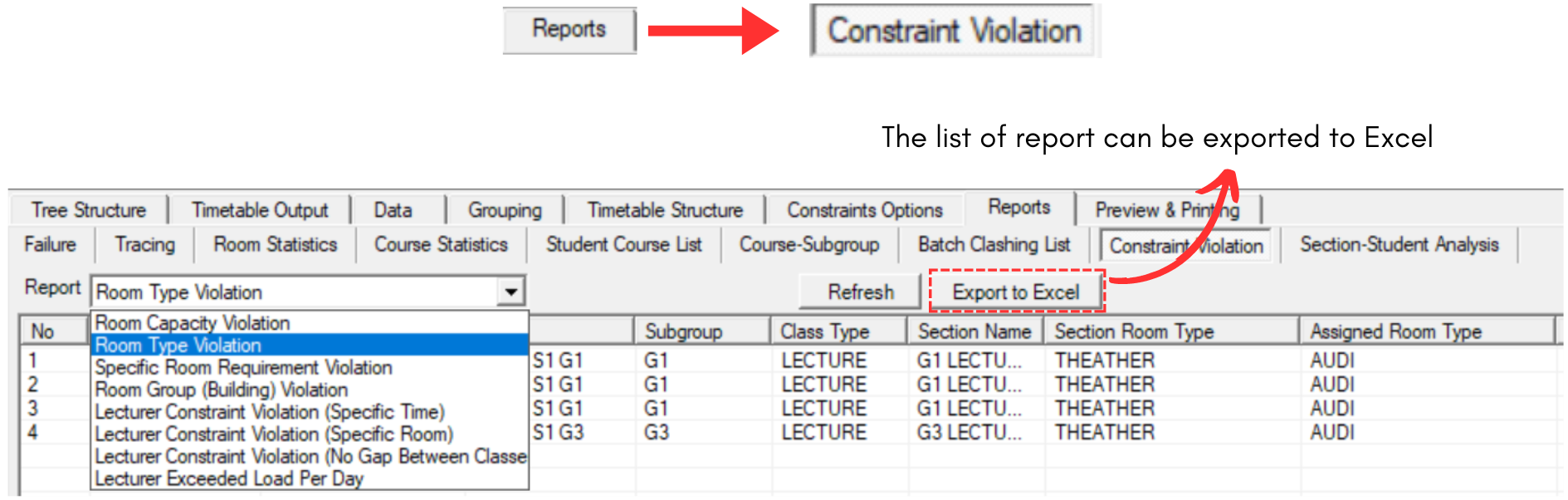 You can view all the available sets of Constraints Violation at the Constraint Violation tab under Report tab.