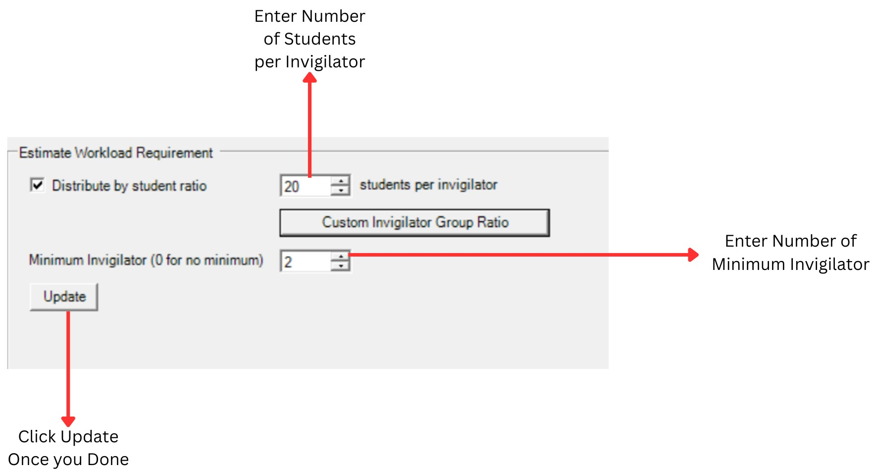 You can Enter a number of Minimum invigilator and 0 means no minimum. For Example: we placed 2 since we need at least 2 invigilators to invigilate the examination.