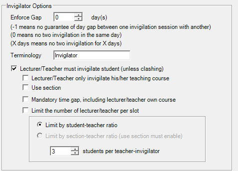 - Limit by section-teacher ratio = You need to tick on Use Section to use this. For example, each course has a few sections and each section has their own lecturer respectively. So you want to limit number of lecturer of the section to invigilate their section bu having the ratio of students to avoid having too much invigilators per slot.