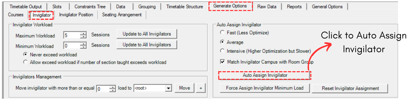 To auto assign invigilator, click Auto Assign Invigilator icon at Invigilator under Generate Options Tab.