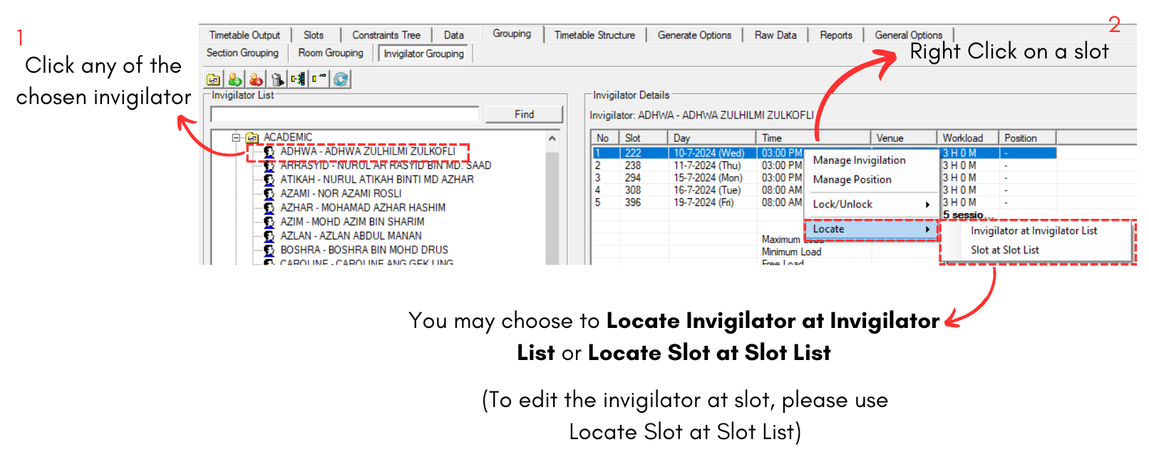 To Locate the invigilator, you may right click on slot and select Locate.