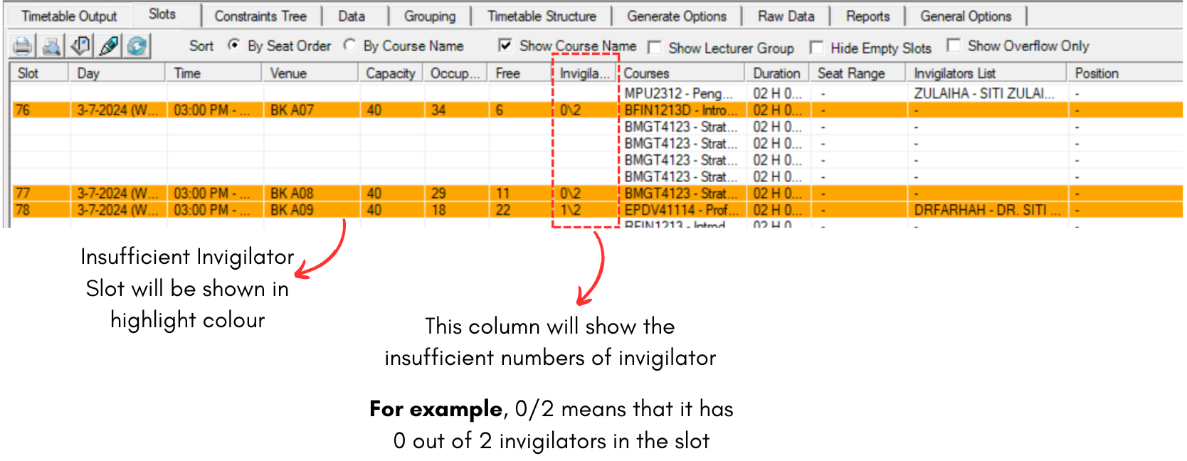 If you choose to highlight this, it will highlight slot that do not have enough invigilator. Refer to the diagram below.