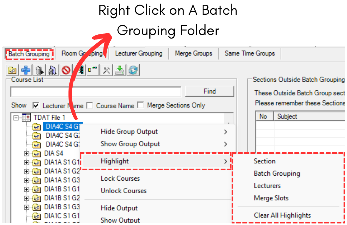 IMPORTANT NOTE: In Timetable Output, you need to choose which section you want to highlight IF the slot has merging or more than one classes/sections.