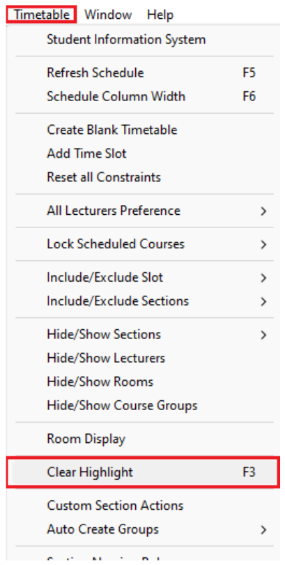 To CLEAR ALL HIGHLIGHT, you can simply do it from the right click function mentioned above OR you can go to Timetable Menu and Select Clear Highlight (F3).
