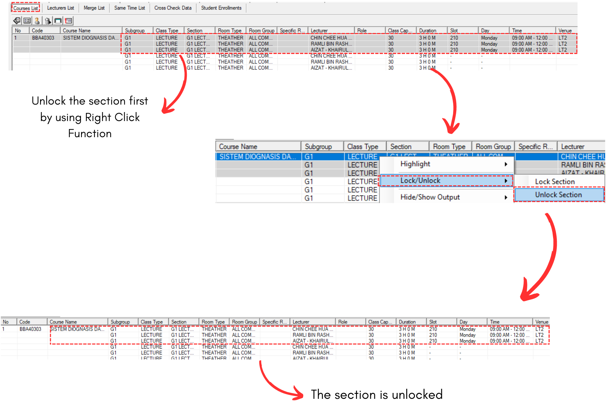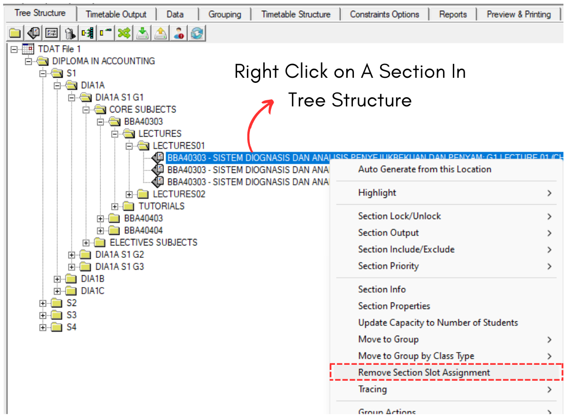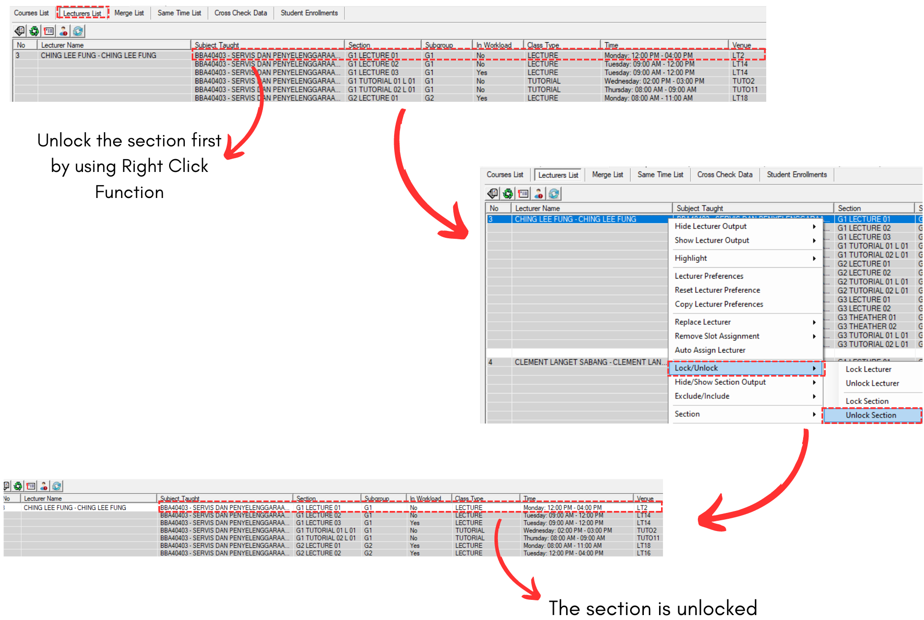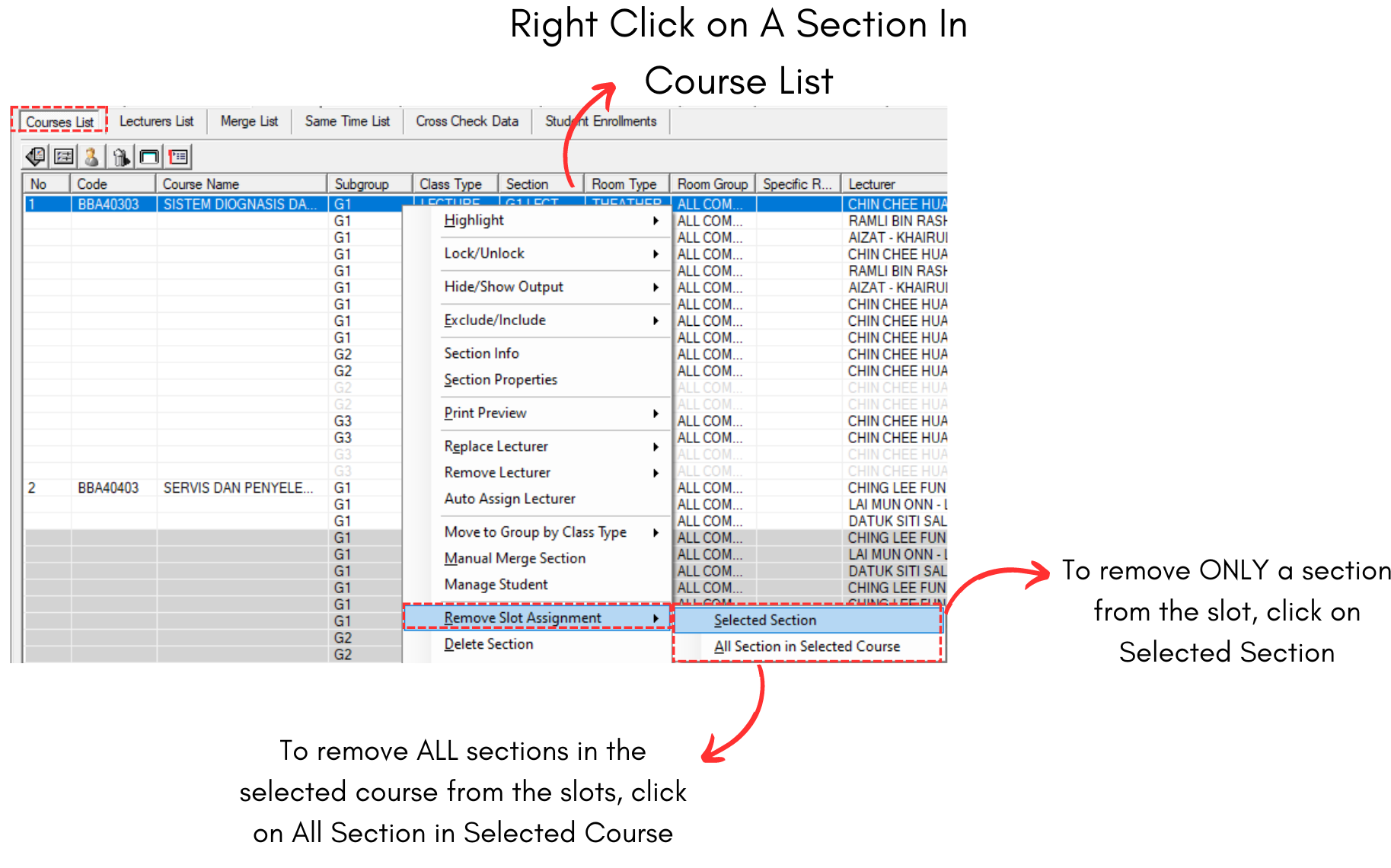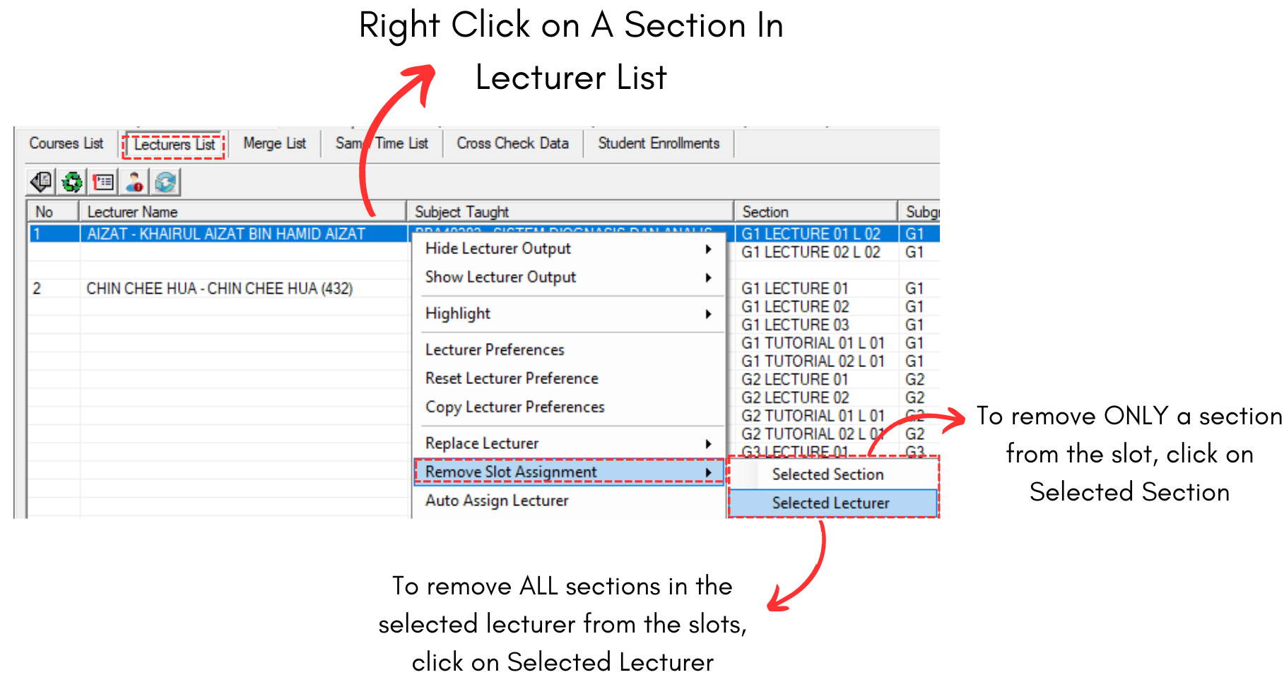 To remove a section from the slot, simply right click the section in the Lecturer List.