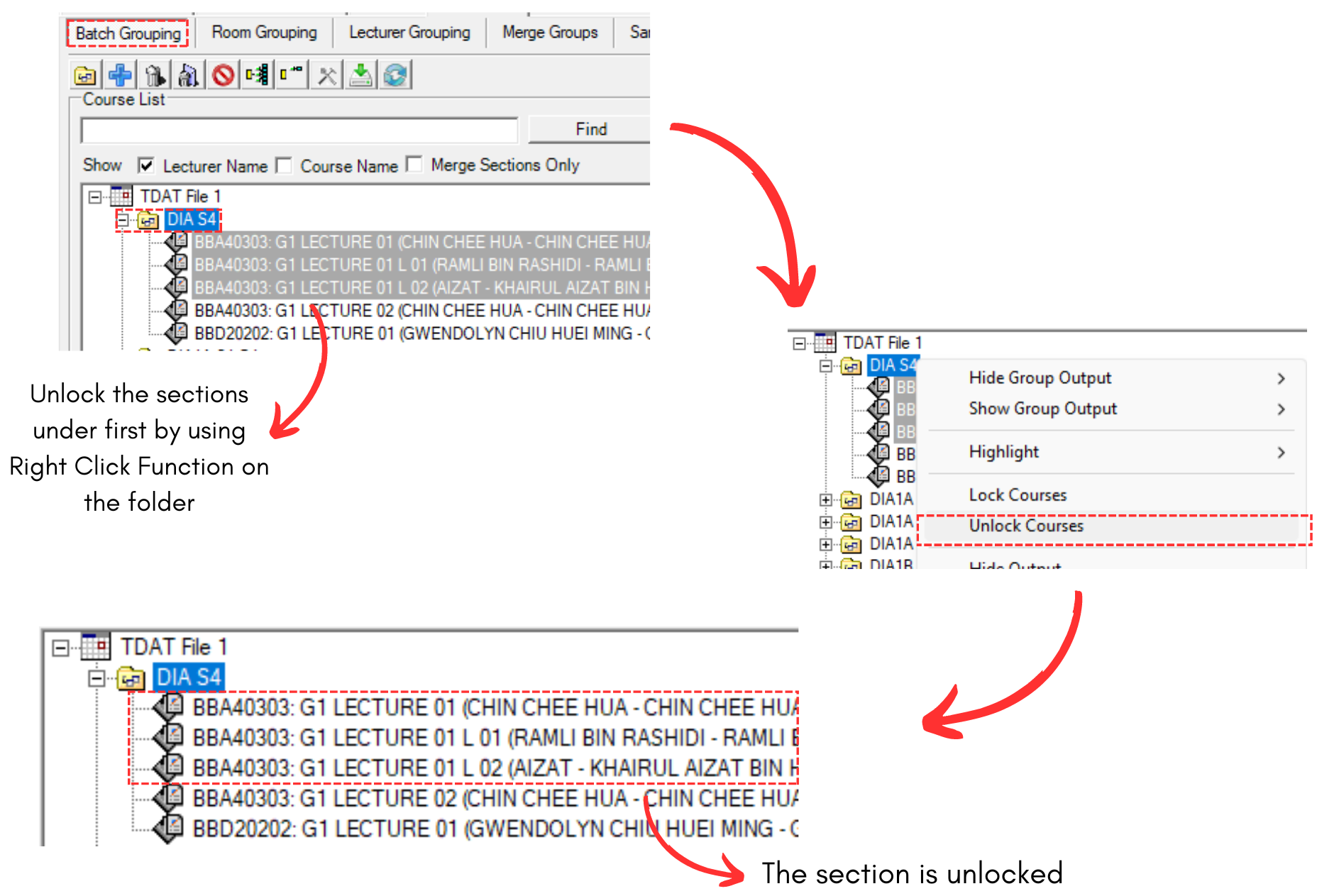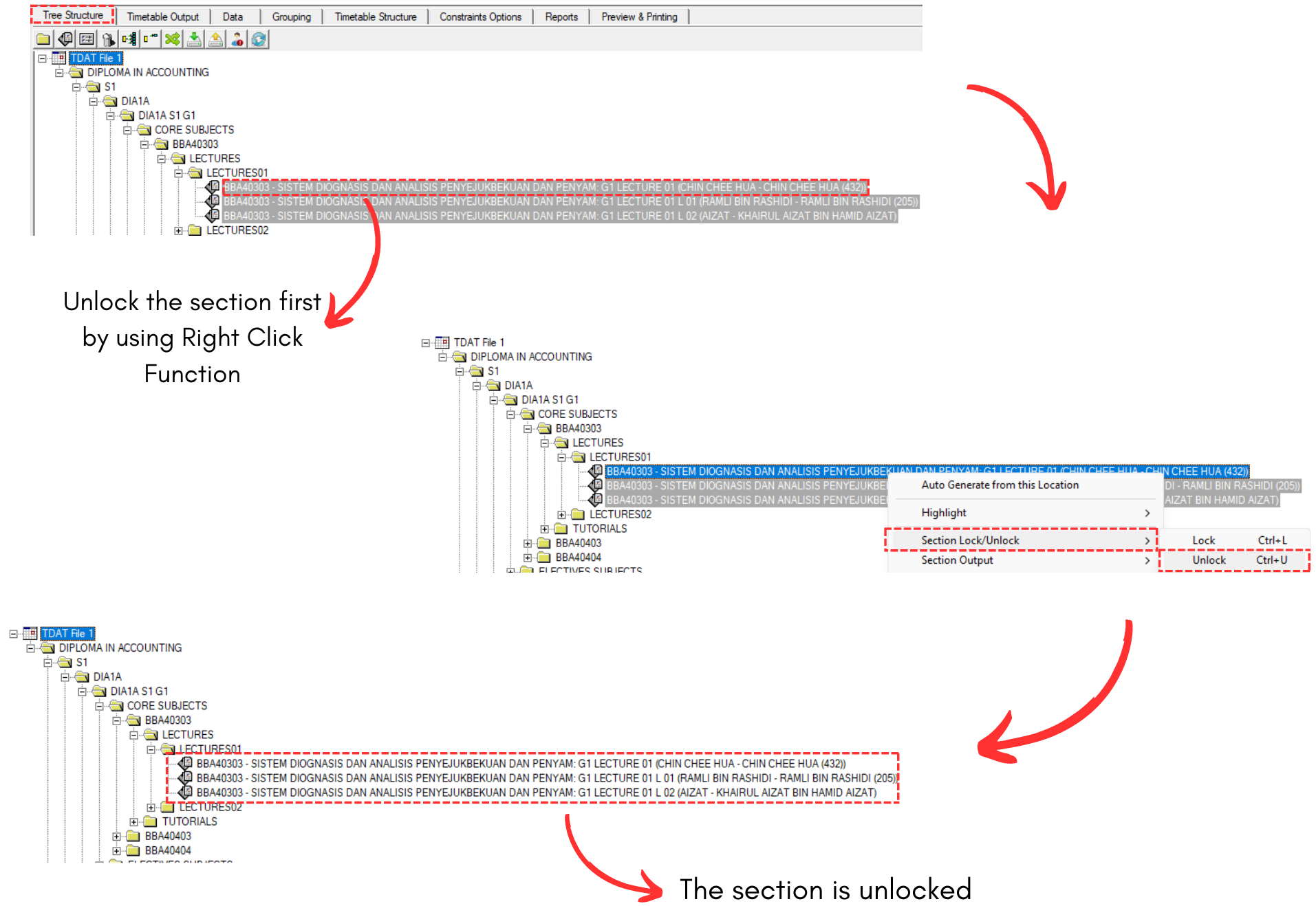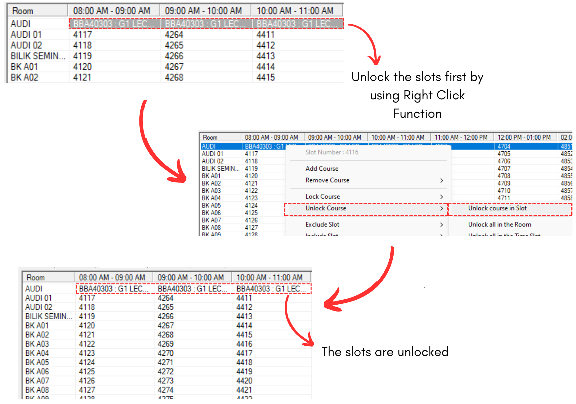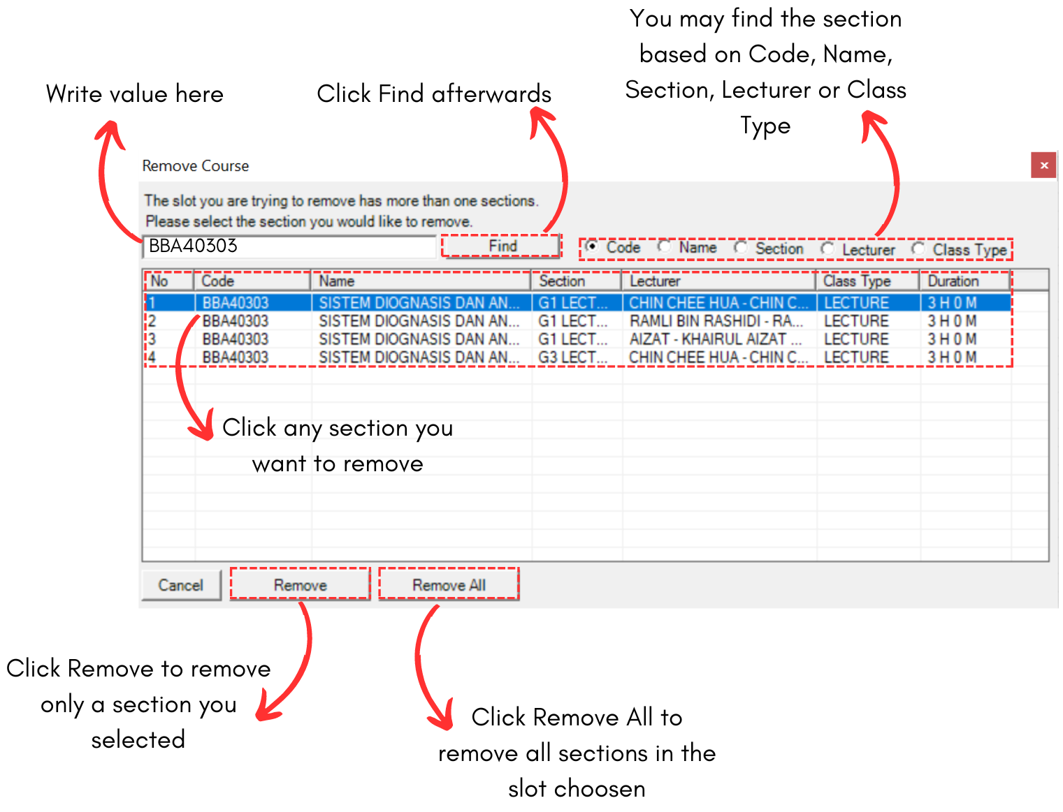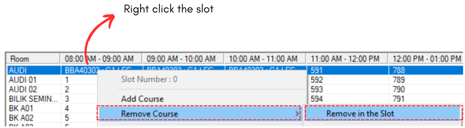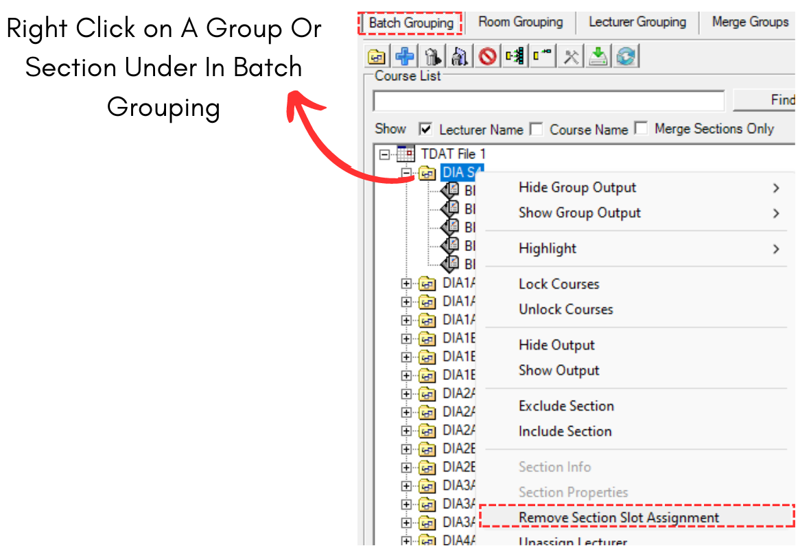 To remove a section from the slot, simply right click the section in the Lecturer List.