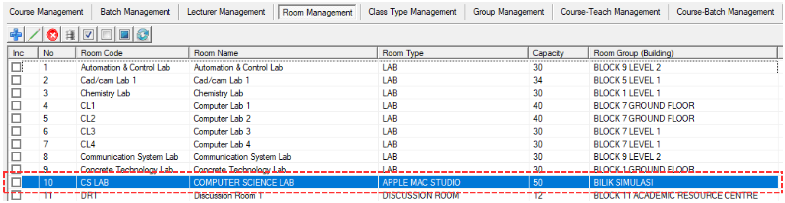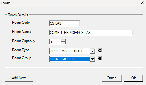 Short name of the room. Room code cannot be duplicated and compulsory. Example: CS LAB