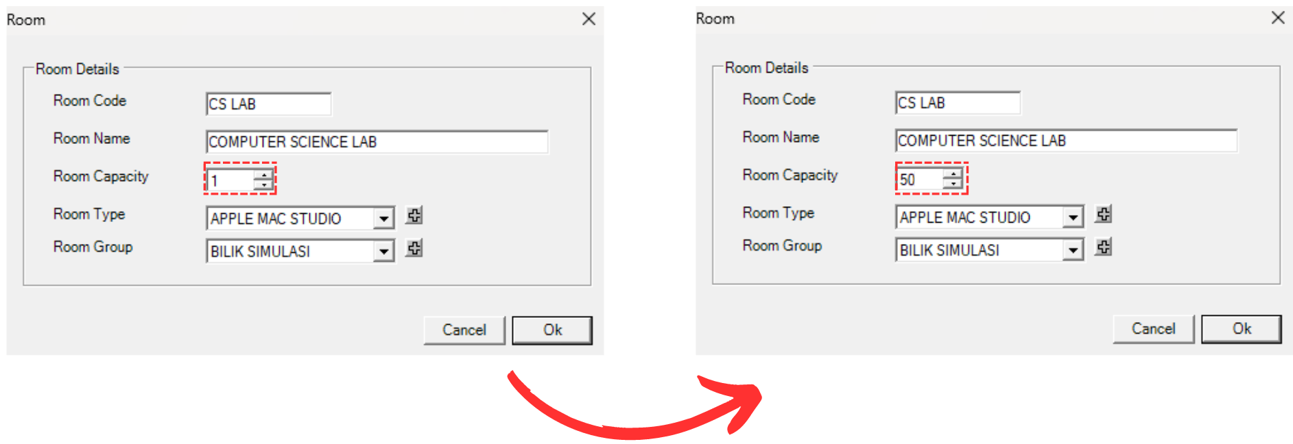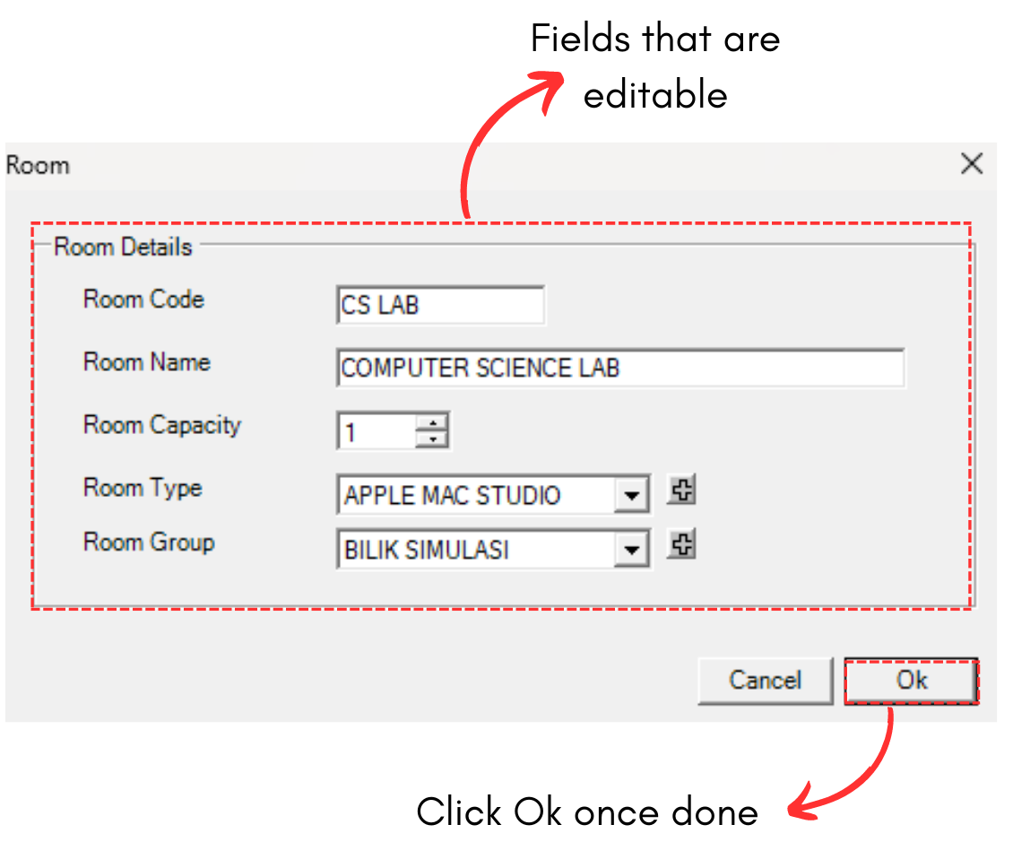 STEPS 3: Edit the Room Details. For Example, we change capacity to 50.