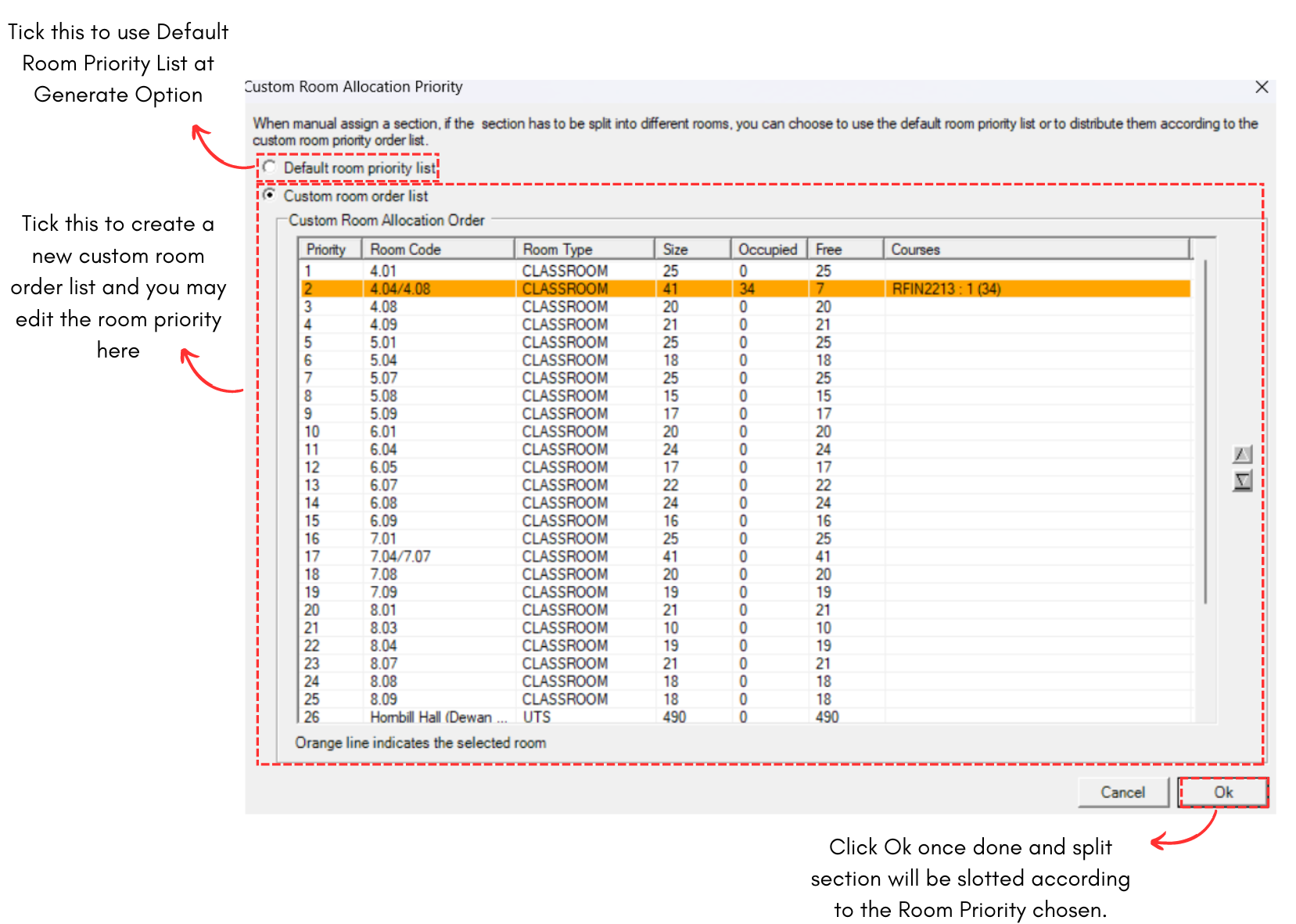 If you click Yes, another popup will appear asking for the split section to be slotted in room according to the previous Room Priority or a new one.