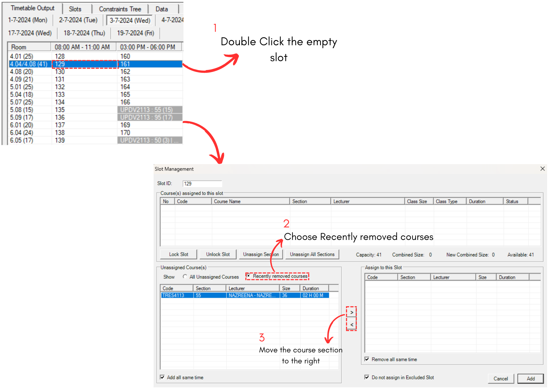 When you found one, you can simply double click the slot and insert the course. Refer to the diagram below.