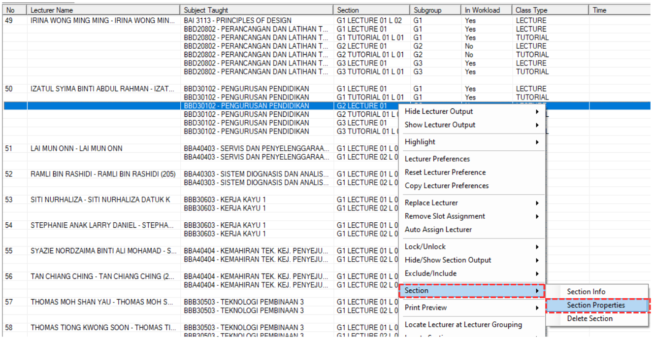 If there are incorrect input data in lecturer list, use right click function on the section and select Section and then Section Properties.