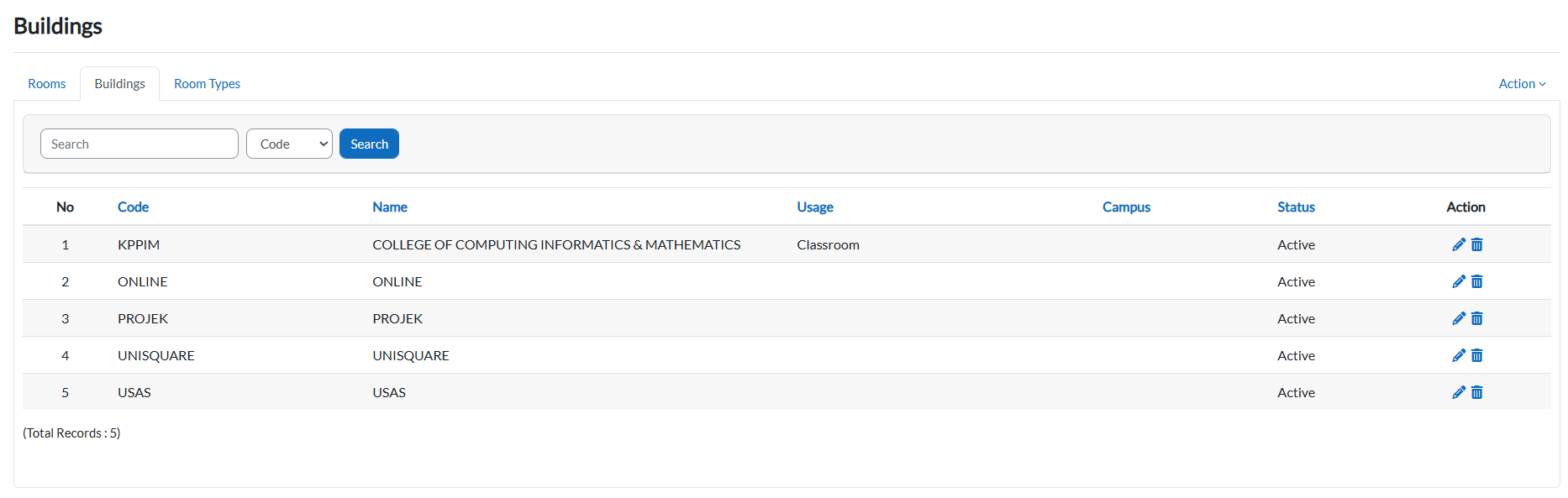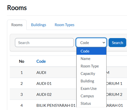 The system will display three sub-tabs: Rooms, Buildings, and Room Types.
