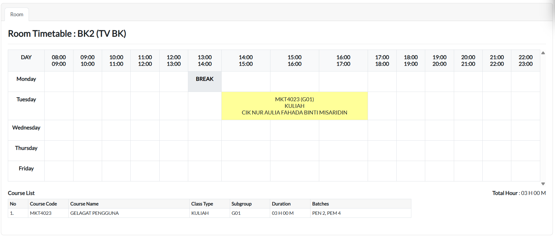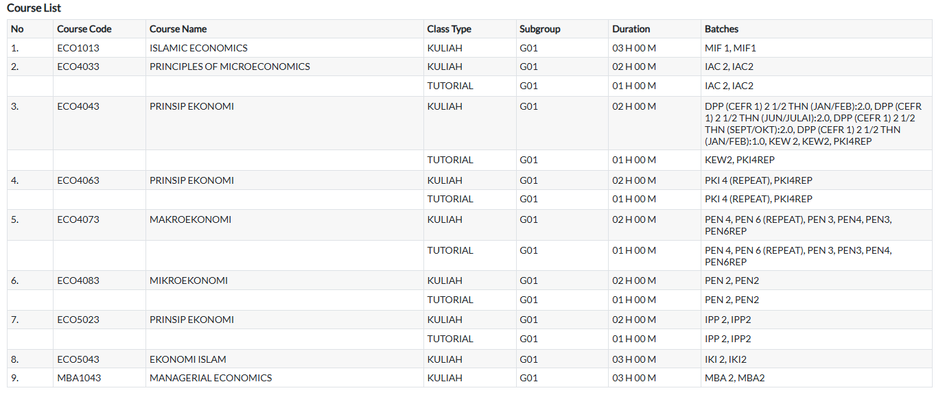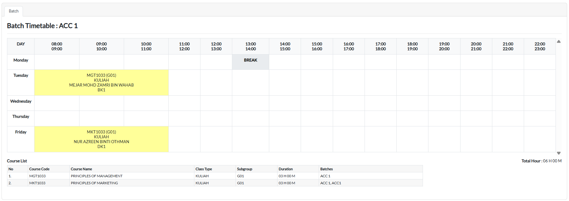 The timetable will appear along with total workload hours and a Course List (course code, name, type, subgroup, duration, batch).