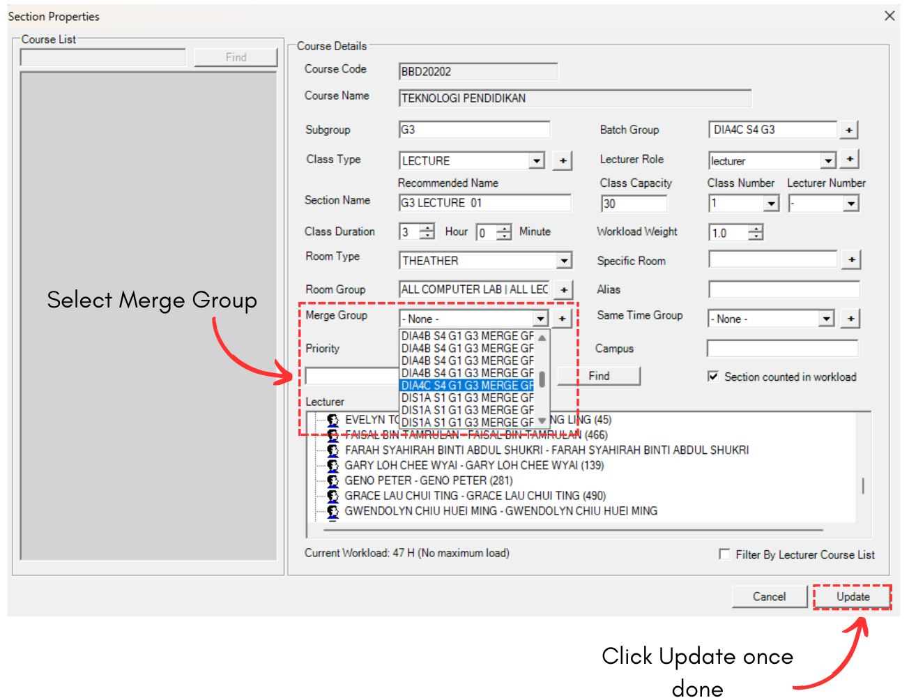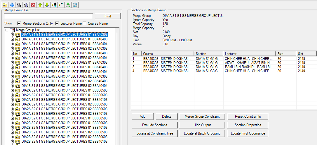 Merge Group is a combination of a few sections under the same group. For example, on a course, you may merge a few subgroups under the same group so that when the class is start, all subgroups will attend the class at the same time, same place and same venue.