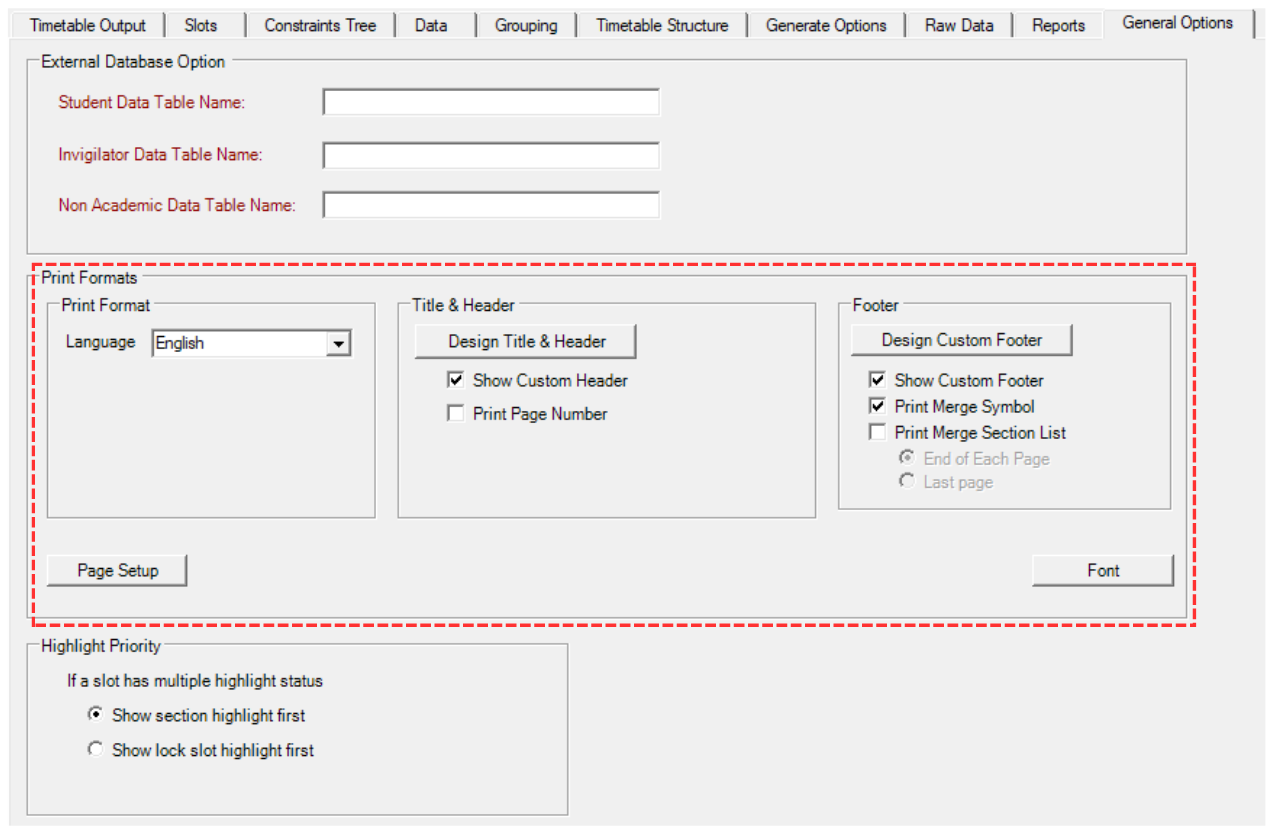Footer is located at the bottom of your printed content page. You may tick your preferred option and if you want to write text on footer, click Design Custom Footer.